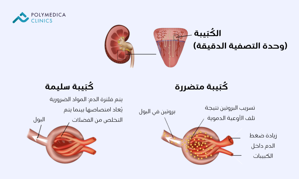 التحكم الضعيف في السكري يُسبب تلفًا بالأوعية الدموية، في حين أن ارتفاع ضغط الدم يزيد من الضرر عن طريق رفع الضغط داخل نظام التصفية بالكلى.